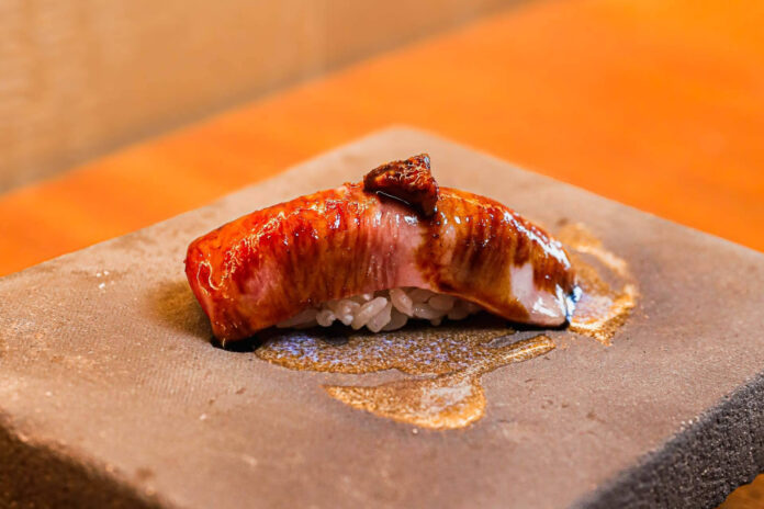 La carta actual permite entender con claridad el marco gastronómico de Kampai. En la parte de barra, la propuesta reúne opciones como hosomaki de salmón, negi toro maki, uramaki de anguila con aguacate, salsa caliente de anguila e ikura, además de handroll de salmón con tobiko y mayonesa yuzu, handroll de atún con erizo y shiso y handroll de wagyu con caviar. A ello se suma una selección de nigiris y sashimis con piezas como salmón, hamachi, lubina, akami, chutoro, otoro, vieira, erizo, amaebi, gamba y wagyu A5, junto a formatos como el sashimi moriawase de tres y cinco variedades.